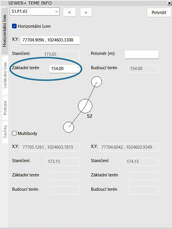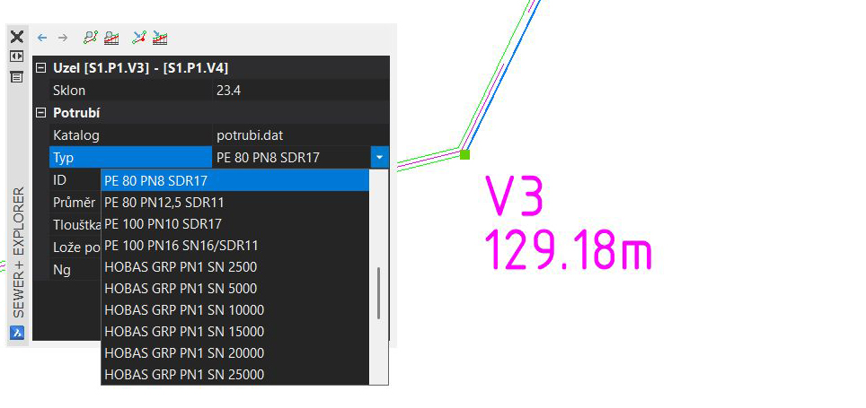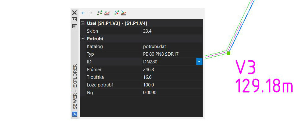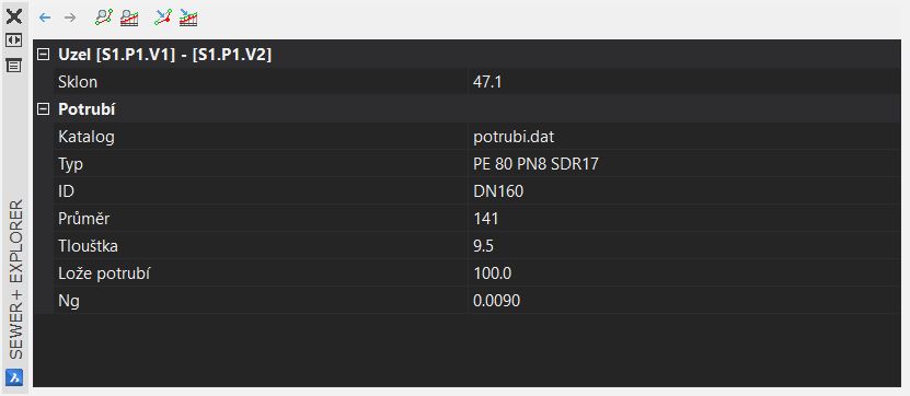 Byly přidány funkce Zpět, Vpřed (modré šipky) pro jednoduché přepínání mezi šachtami a možnost upravovat parametry nejen u potrubí a šachet, ale i v jednotlivých lomech.