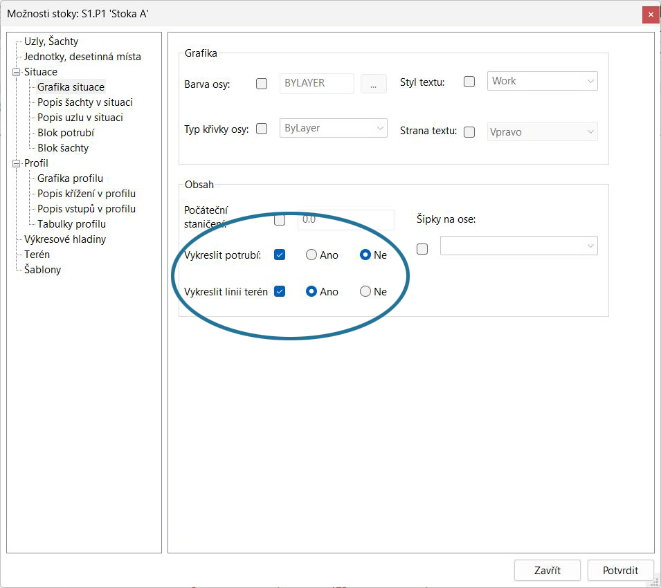 Opět je dostupná volba pro zapnutí zobrazení linie stávajícího terénu.
